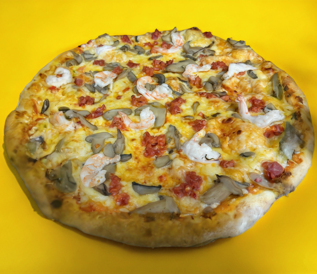 Pizza grande 8 rebanadas de Champiñones, chorizo, camarones y queso.