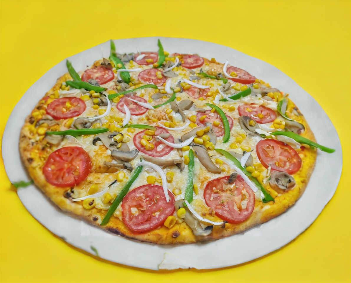 Pizza grande 8 rebanadas de Jitomate, champiñones, granitos de elote, pimiento morrón, cebolla y queso.