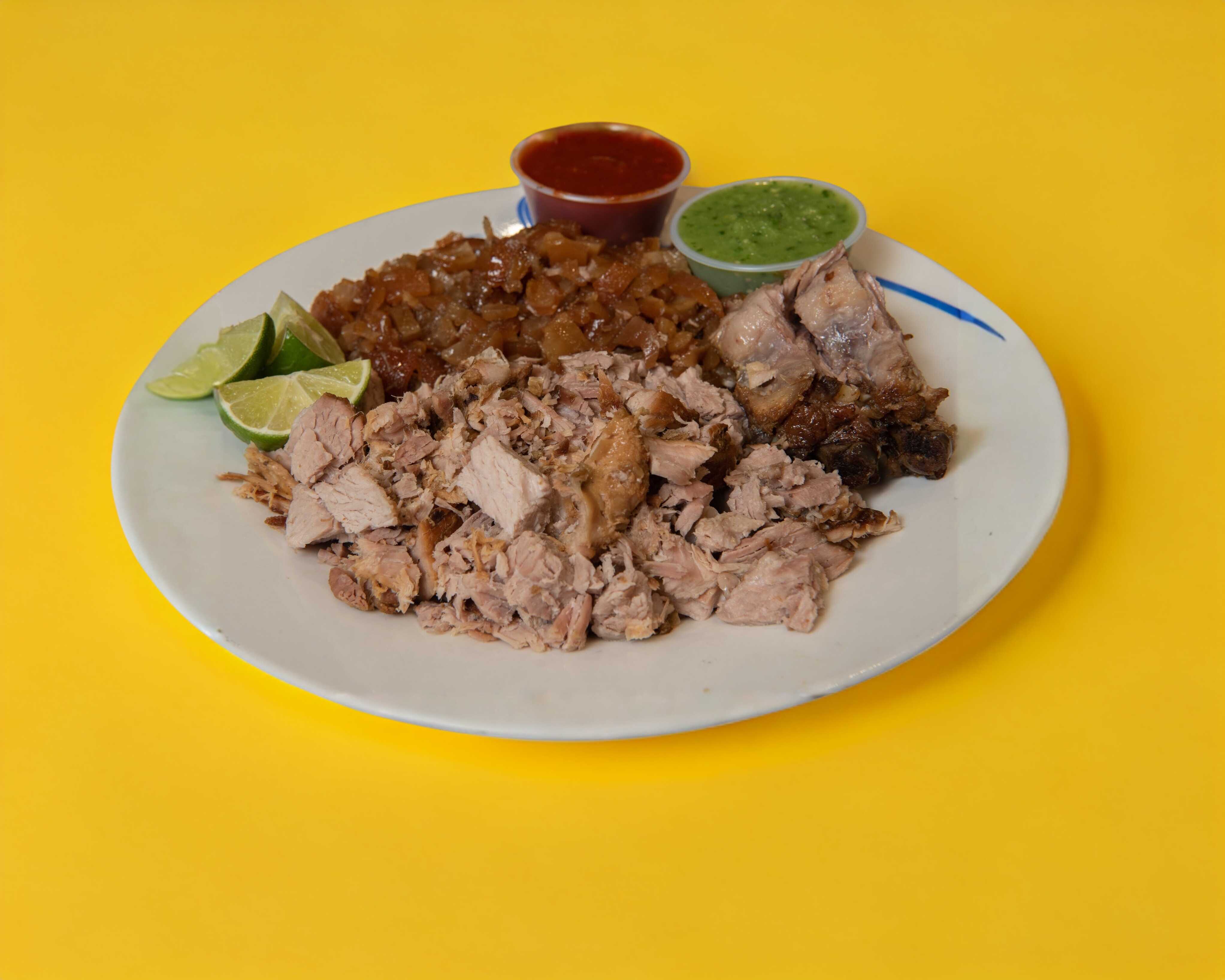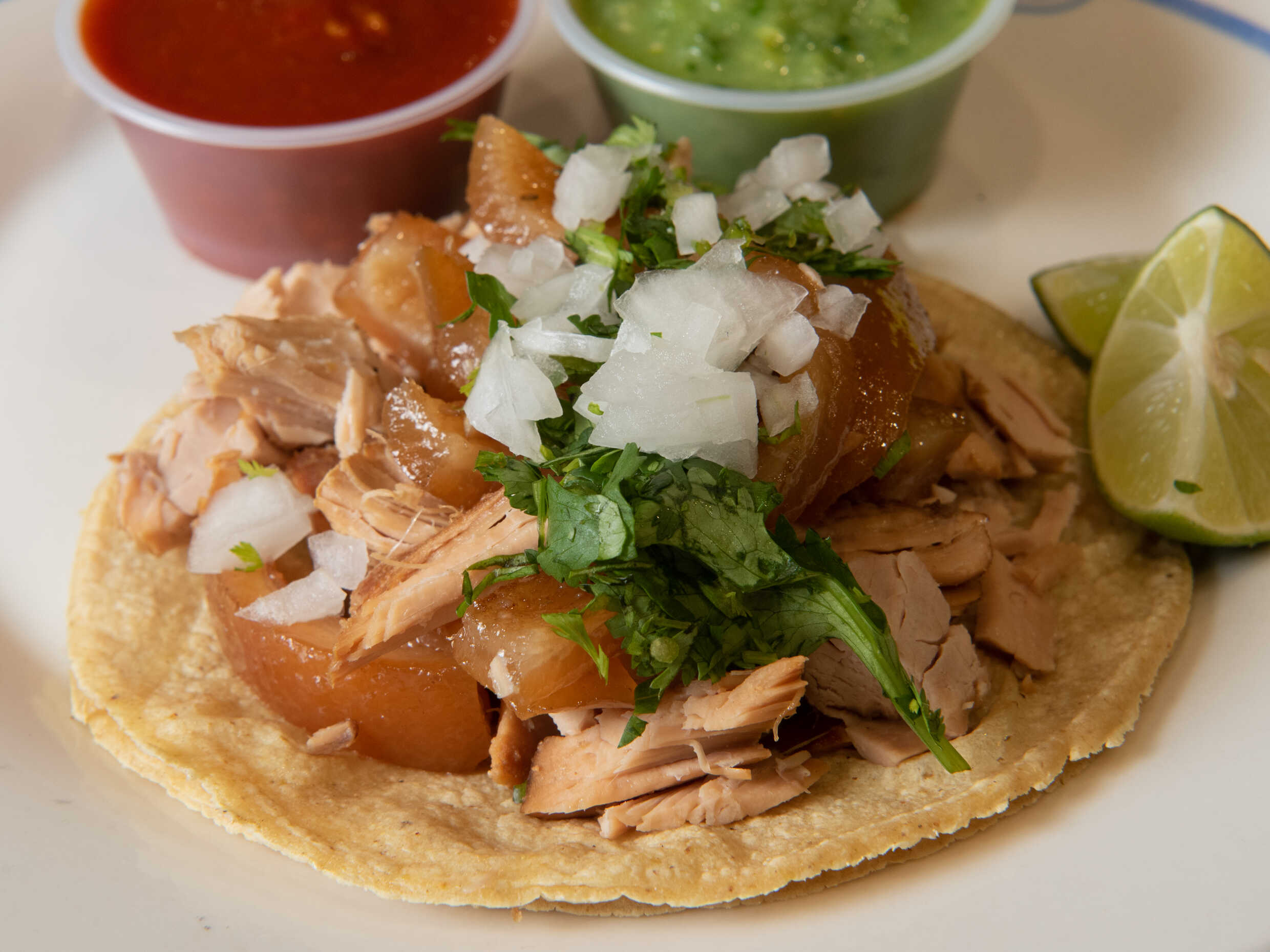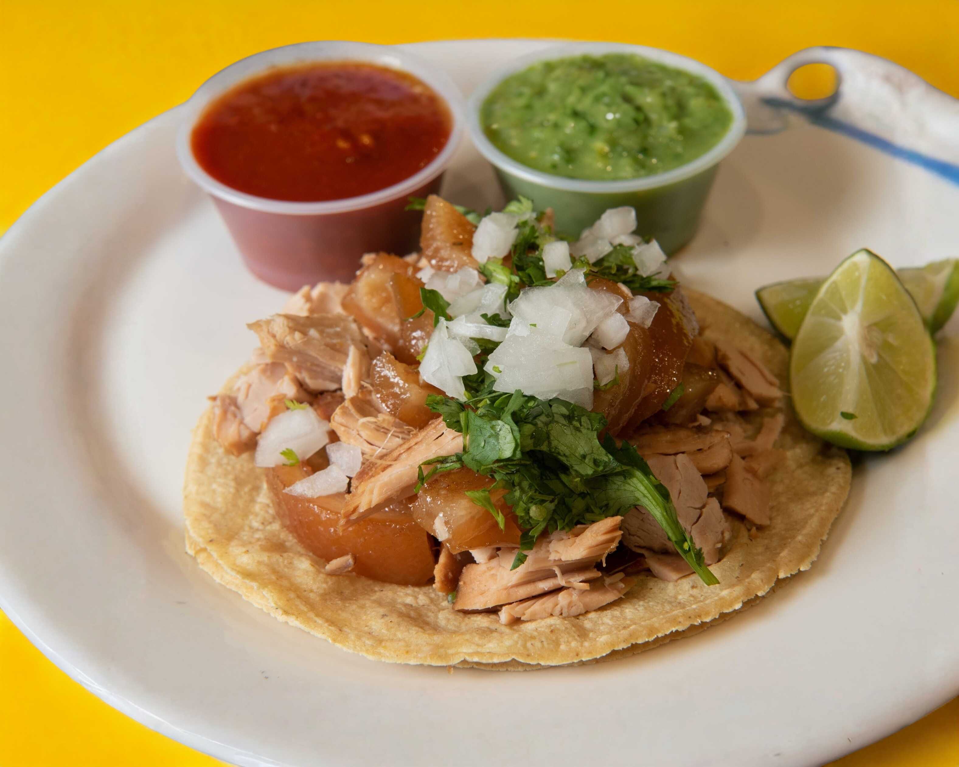 Taco de carnitas: tortilla de maíz mediana, 100 gramos de carne campechano, verdura (cebolla, cilantro y limones) aparte y salsa a elegir.