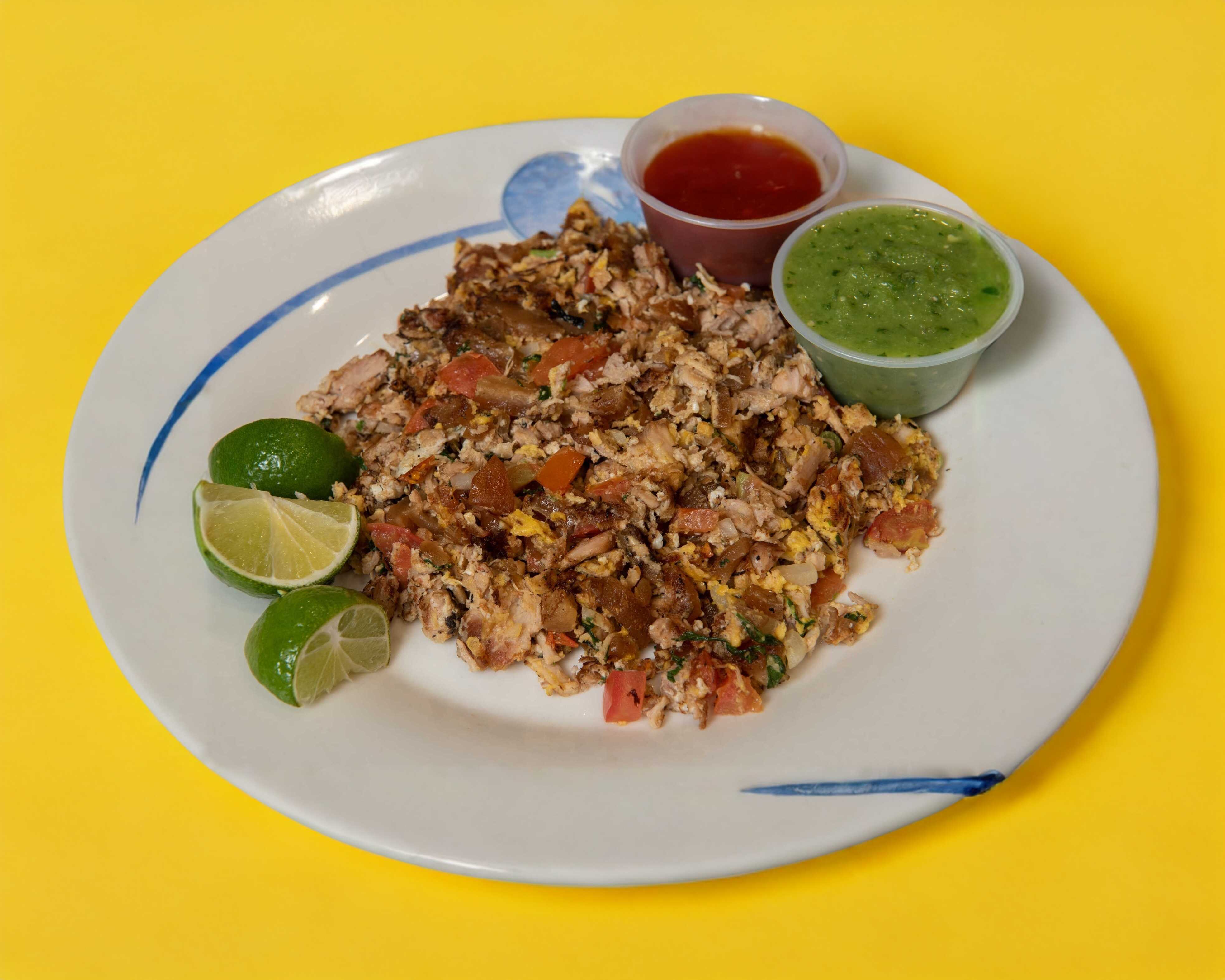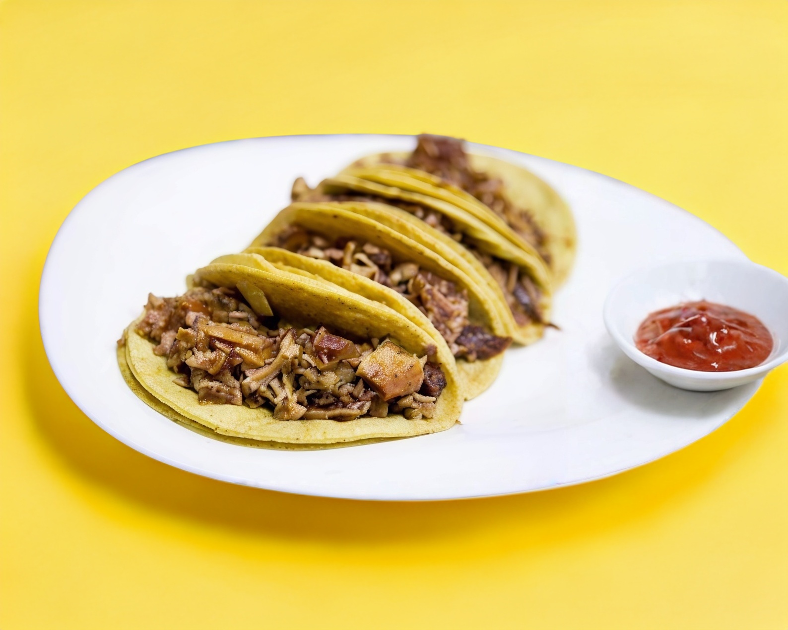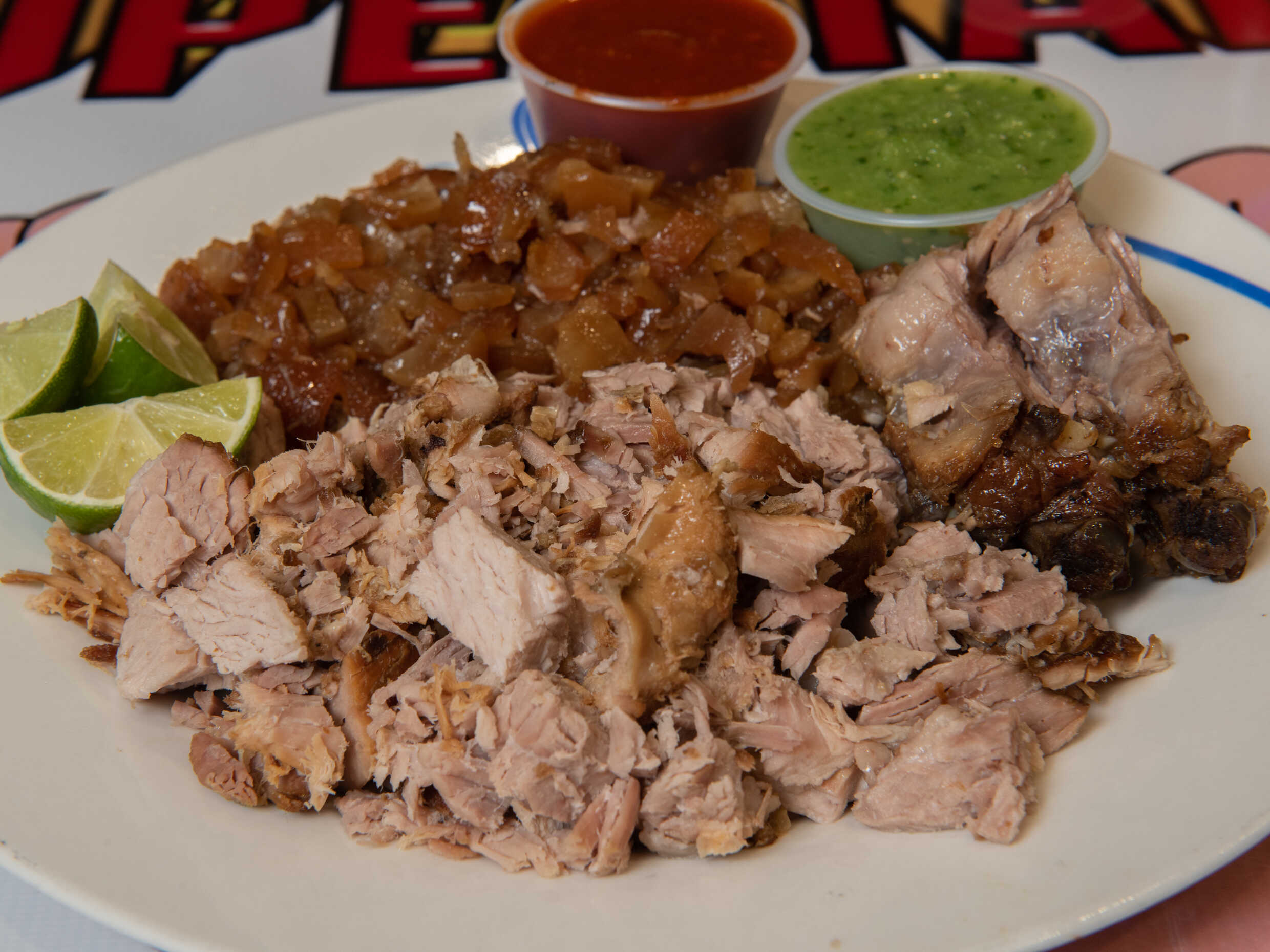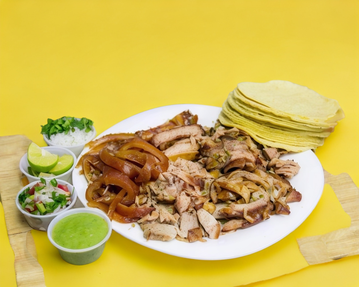 Taco de carnitas: tortilla de maíz mediana, 100 gramos de carne campechano, verdura (cebolla, cilantro y limones) aparte y salsa a elegir.