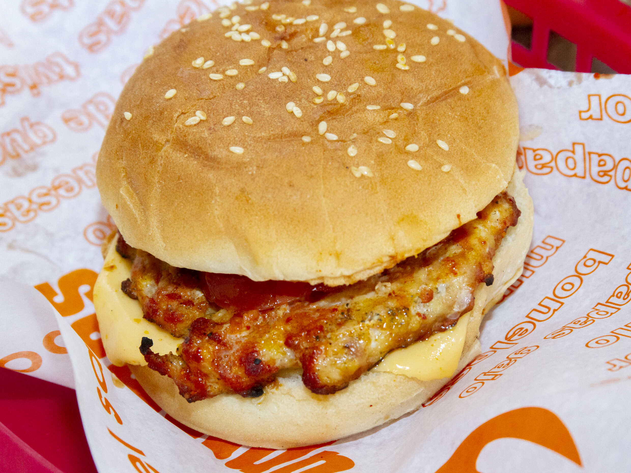 Carne de res, tocino, aros de cebolla, queso amarillo, jitomate, lechuga, cátsup, aderezo de chipotle y mayonesa.