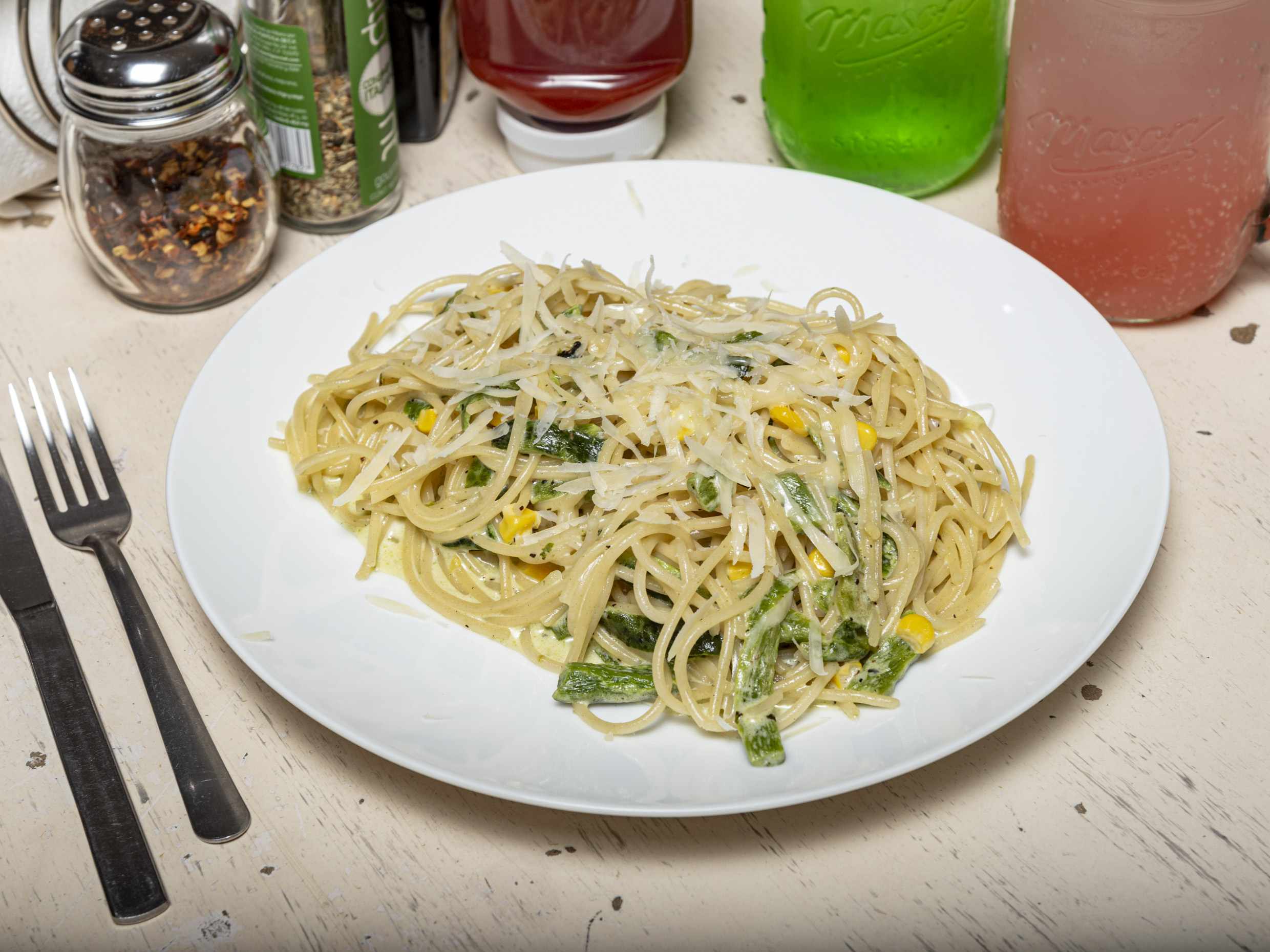 Espagueti con crema, rajas de chile poblano y grano de elote.