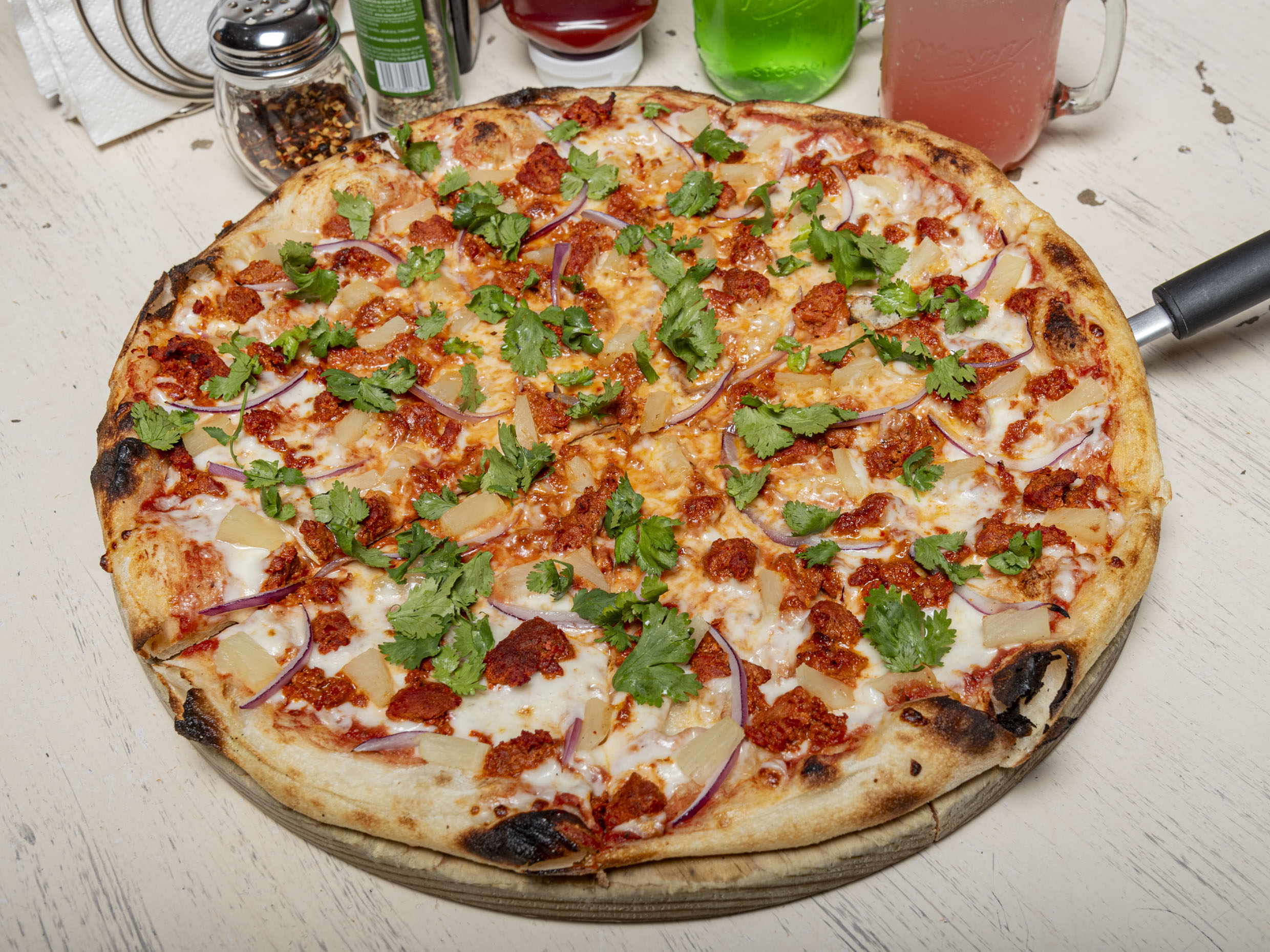 Base de jitomate con queso mozzarella. Carne al pastor, piña, cebolla y cilantro.