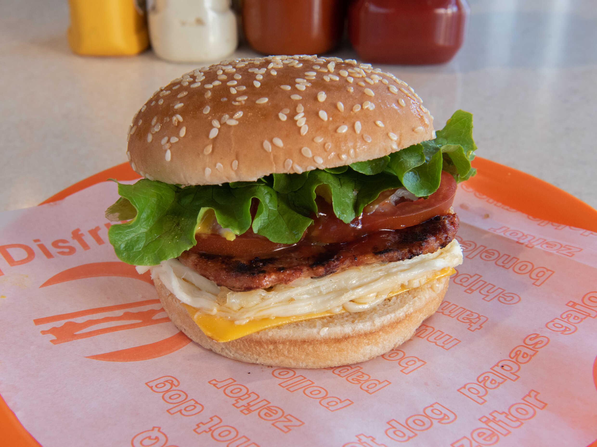 Carne, Queso Amarillo, Tocino, Salsa BBQ, Lechuga, Cebolla y Chiles