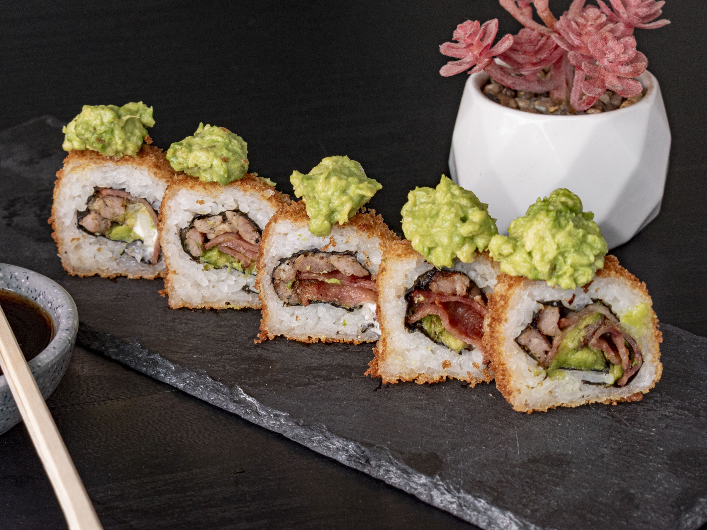 (12 pzas) Por dentro camarón empanizado, arrachera, queso gouda, aguacate, queso philadelphia. Por fuera mermelada de tocino