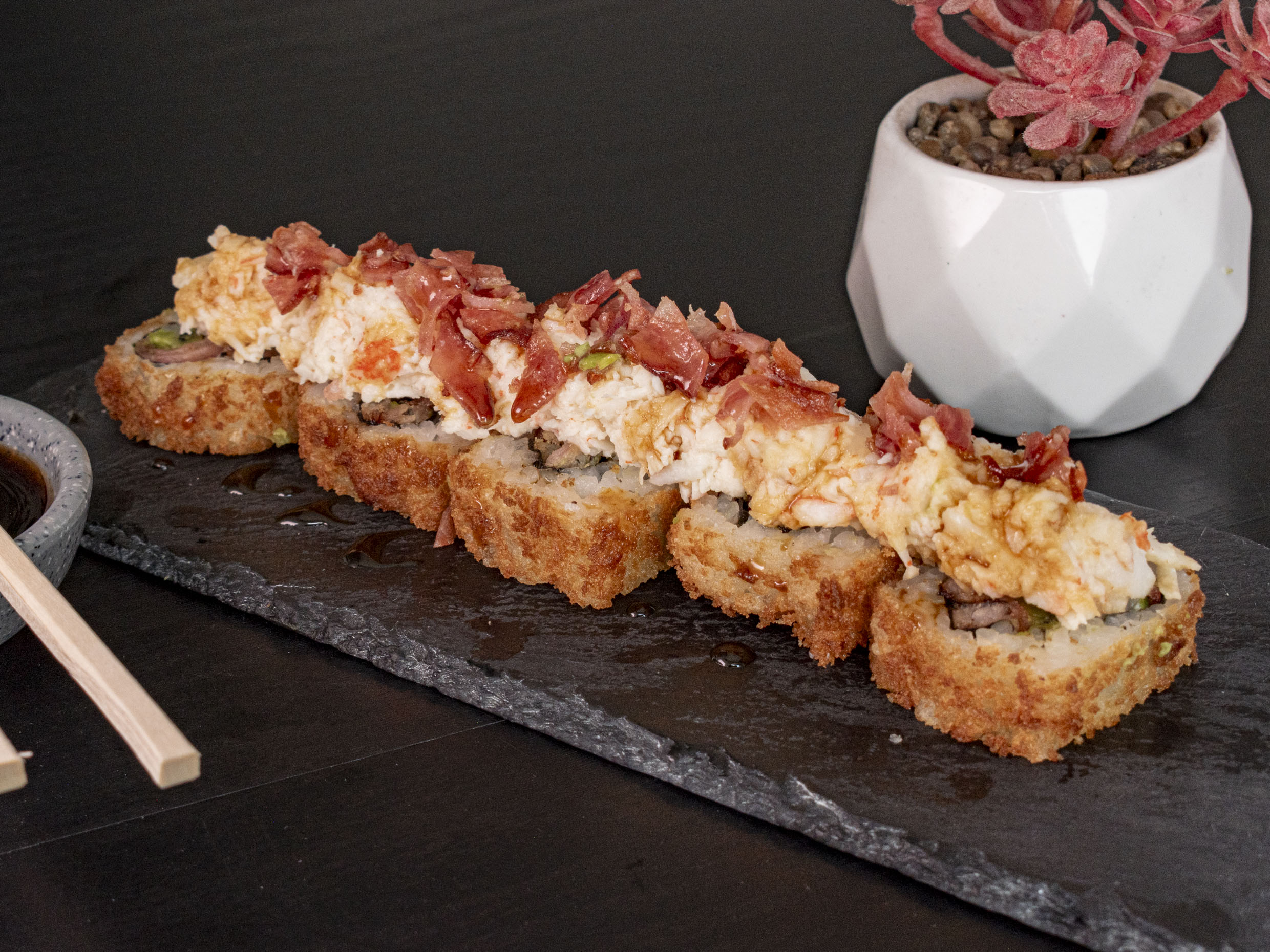 Bola de arroz empanizado rellena de tampico, queso philadelphia, queso gouda, aguacate. Por fuera tampico, arrachera, camarón, tocino, salsa de anguila