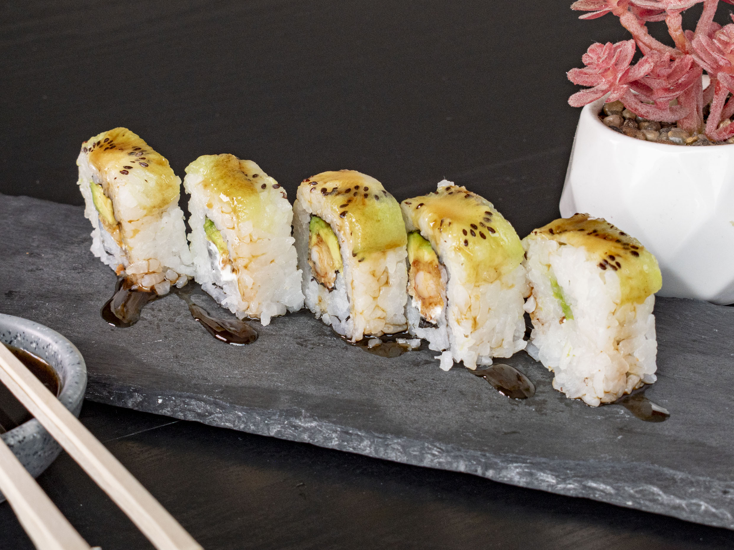 (12pzas) Por dentro camarón empanizado, aguacate, queso philadelphia, pepino. Por fuera tampico, aguacate, chipotle, salsa de anguila.