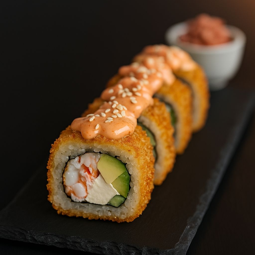 (12 pzas) Por dentro camarón, cangrejo, queso philadelphia, aguacate, pepino. Por fuera alga empanizada, aderezo yum
