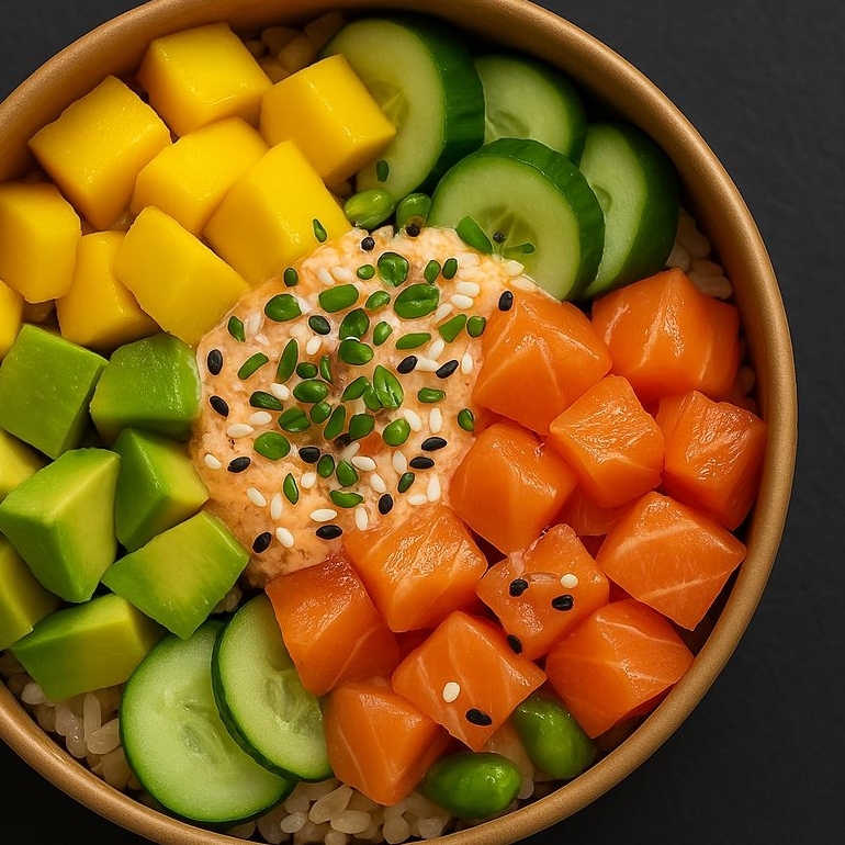 Arroz gohan, con salmón, masago, aguacate, edamame, suma de pepino, mayonesa