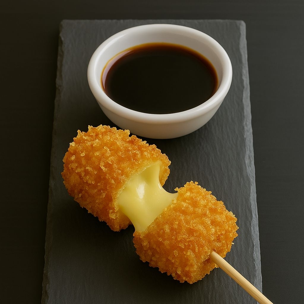 Brocheta empanizada de jalapeño rellena de queso gouda y queso philadelphia