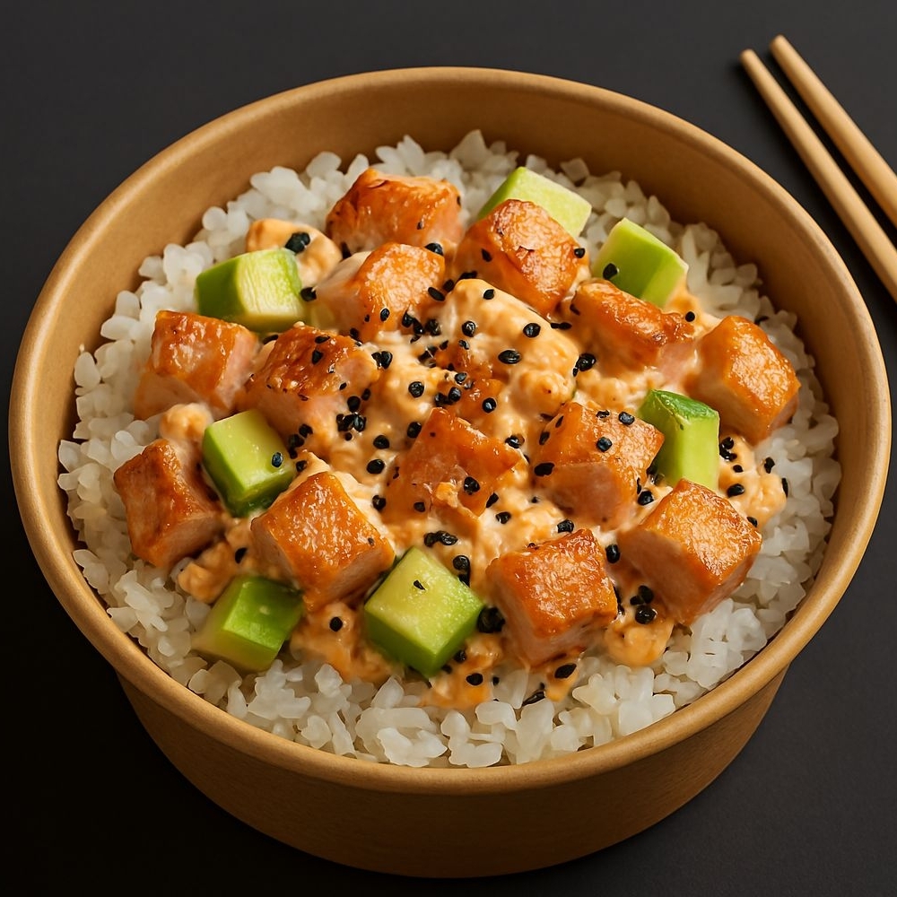 Arroz gohan, salmón crudo en salsa yum yum, mango, aguacate, piel de salmon frita