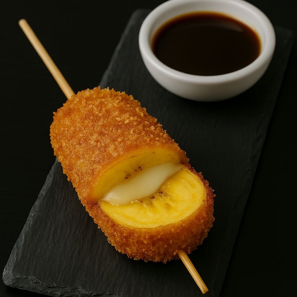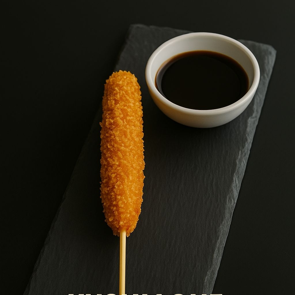 (12 pzas) Por dentro kushiage de cangrejo con queso philadelphia. Por fuera cubierta de kiwi, nuez caramelizada y salsa de anguila