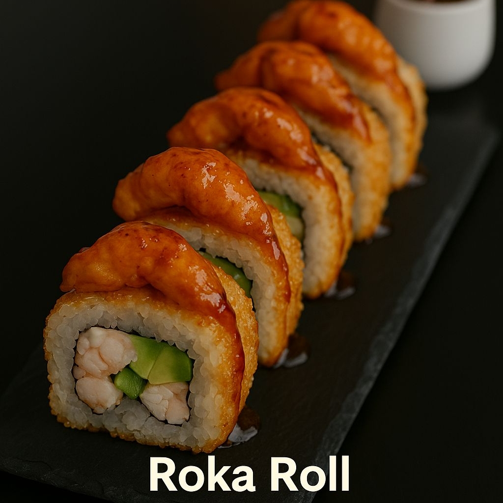(12pzas) Por dentro camarón, aguacate, queso philadelphia. Por fuera camarones roka con aderezo chipotle, tocino y cebollín
