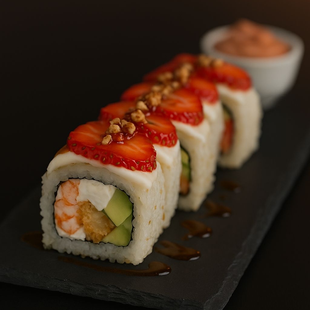 (12 pzas) Por dentro camarones coco empanizados, philadelphia, aguacate. Por fuera cubierta de queso philadelphia, fresas, nuez carameliza, salsa de anguila