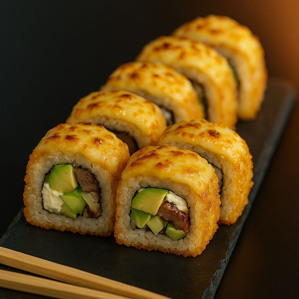 (12 pzas) Por dentro queso gouda, arrachera, aguacate, queso philadelphia. POr fuera gratinado de queso gouda y tampico.