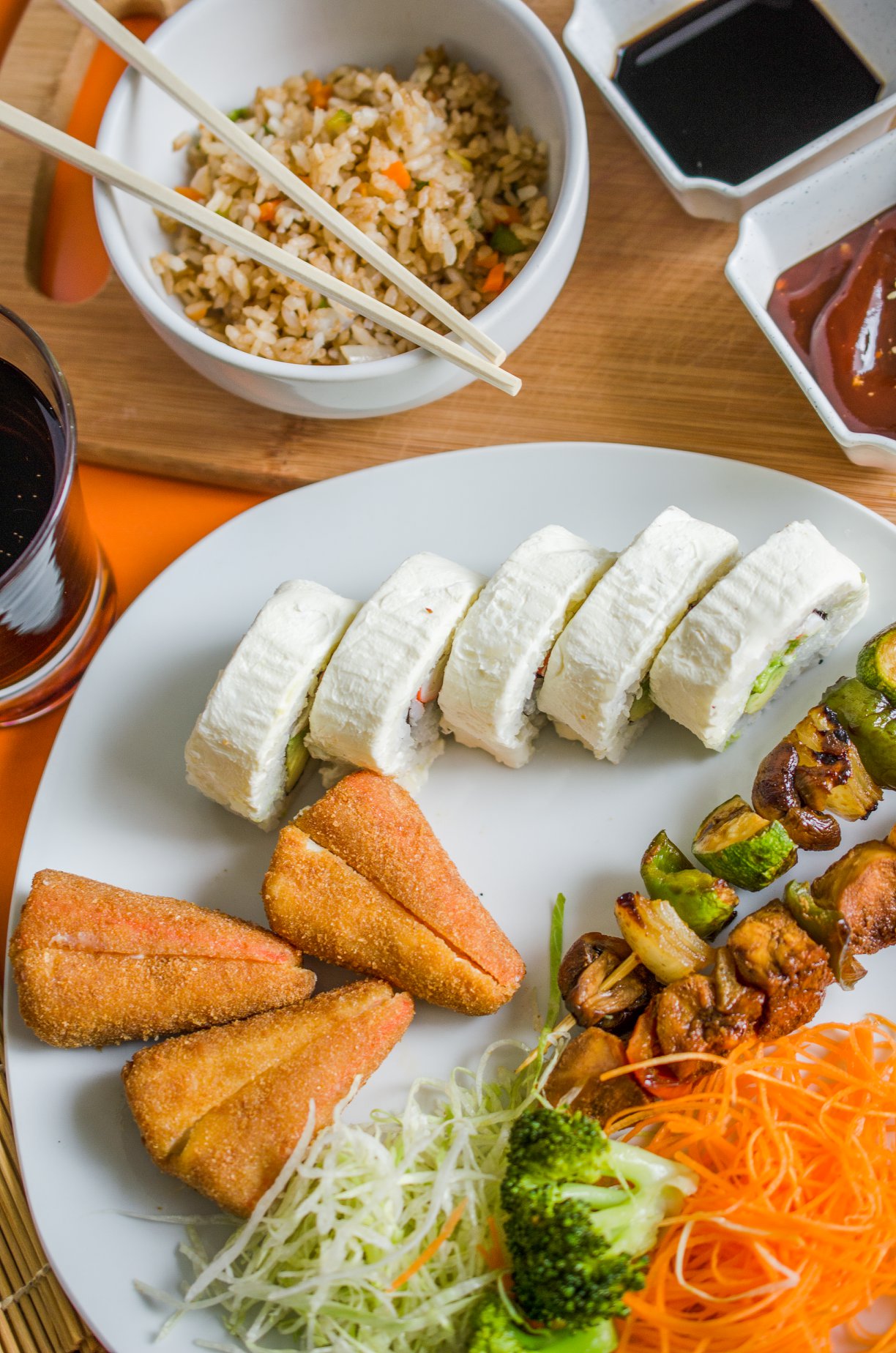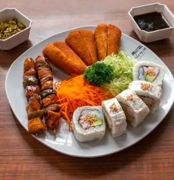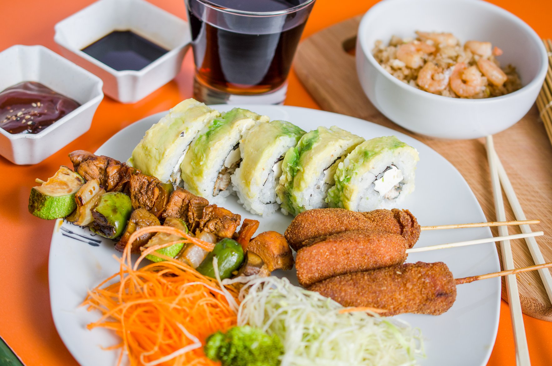 Medio yakimeshi con pollo, medio california de surimi, 3 brochetas, 1 bola de helado y refresco.