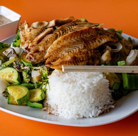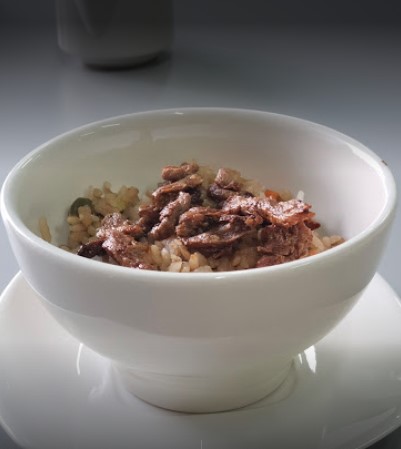 Arroz al vapor con pollo y salsa teriyaki.
