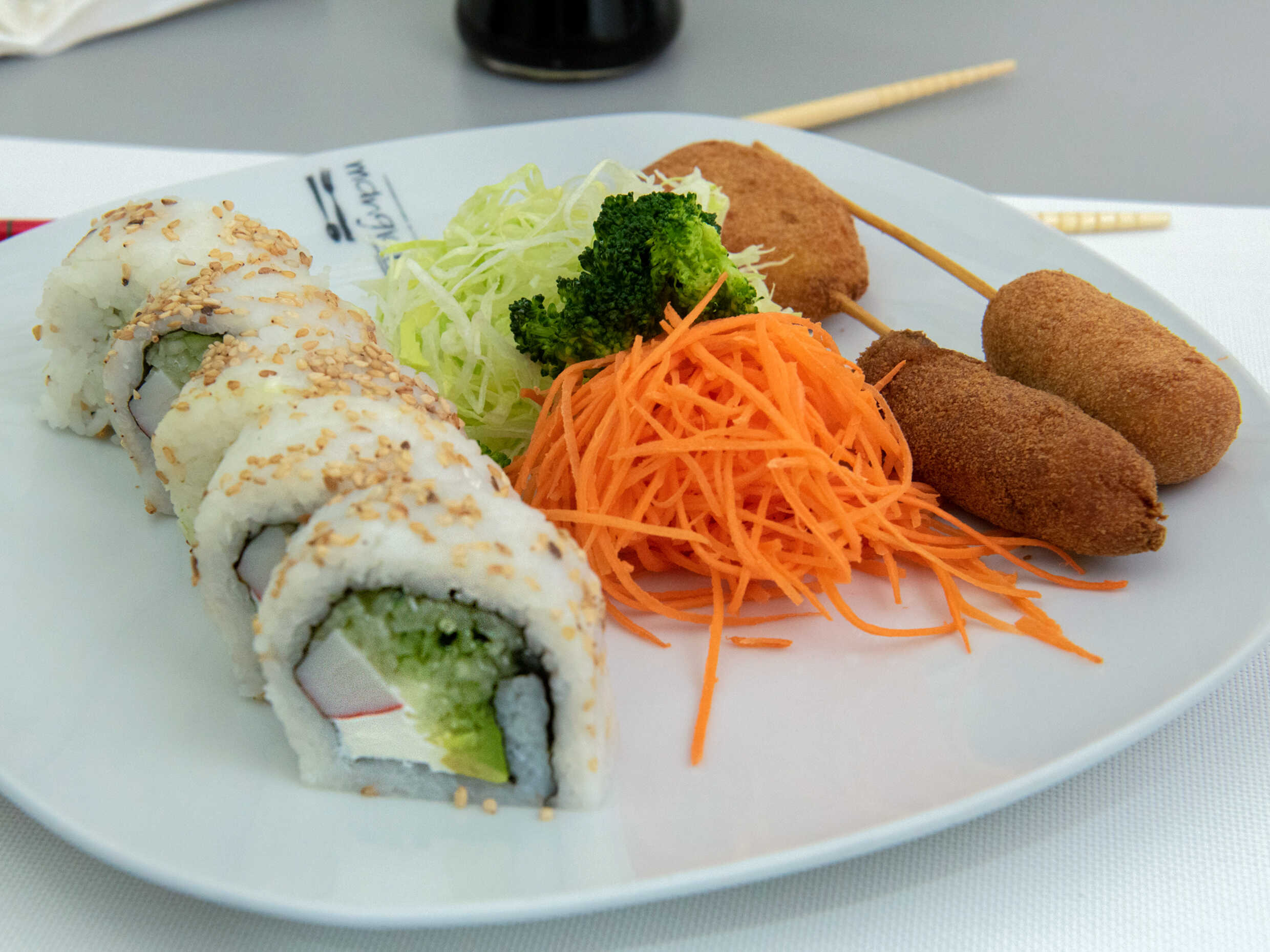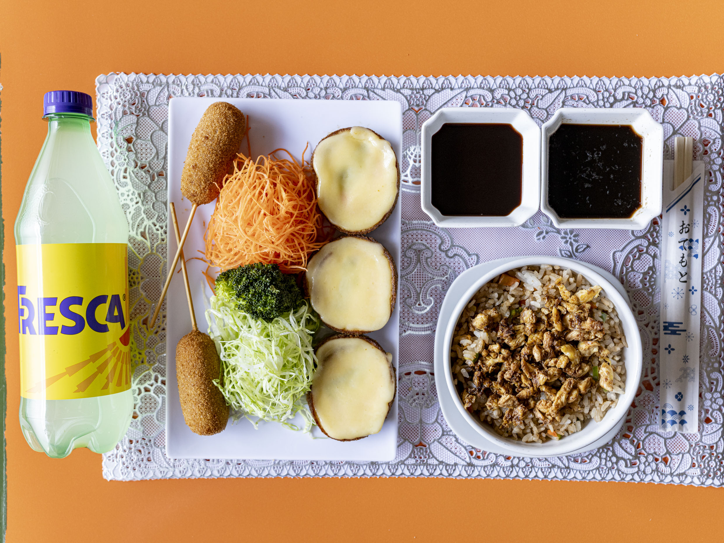 3pz torikatsu, 2 brochetas, 1 kanimaki, 1 refresco y medio yakimeshi con verduras.