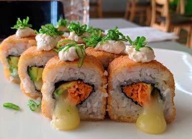 Rollo de camarón empanizado, zanahoria , aguacate, queso m.