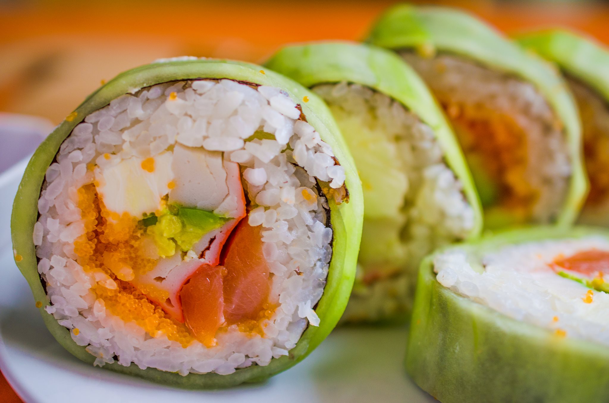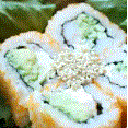 Aguacate, piña, surimi y queso con kiwi por fuera