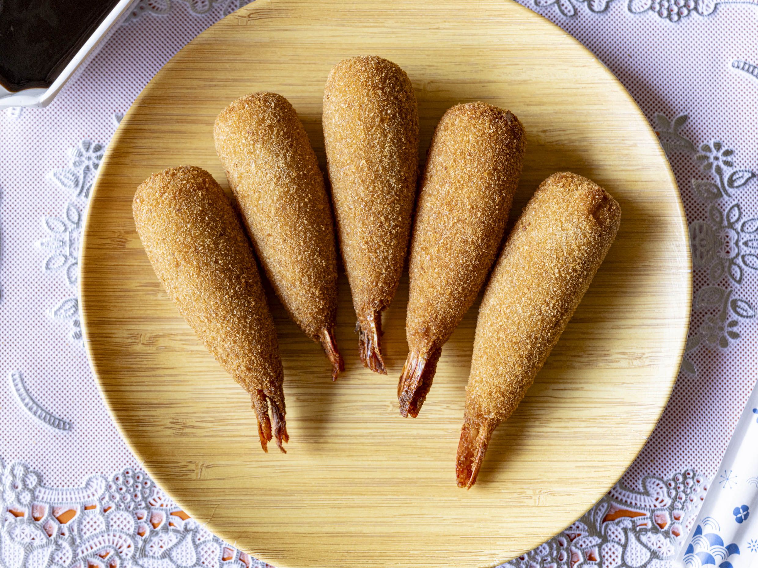 5 piezas de camarón con queso empanizados.