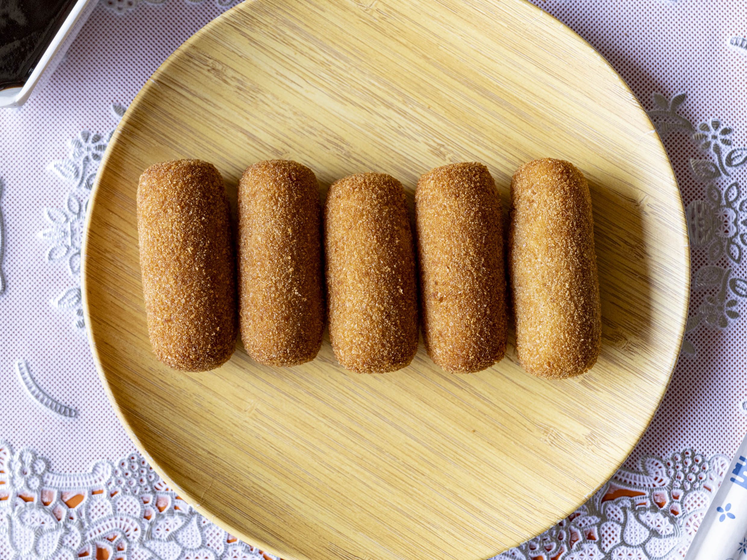 Rollo de pollo empanizado con pimiento, cebolla, zanahoria, gratinado 6 piezas.