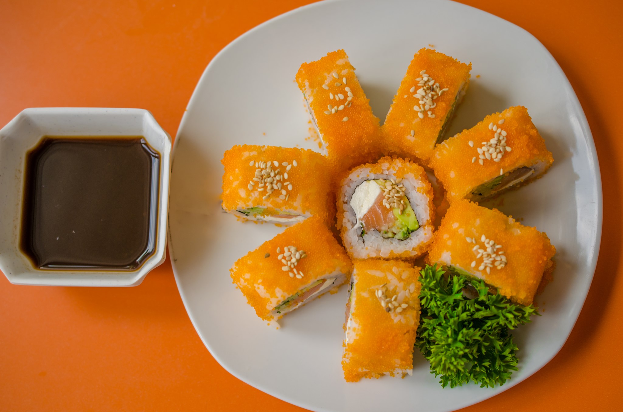 1 Rollo de sushi de 10 piezas de sushi con camarón, aguacate, queso philadelfia y tampico por fuera.