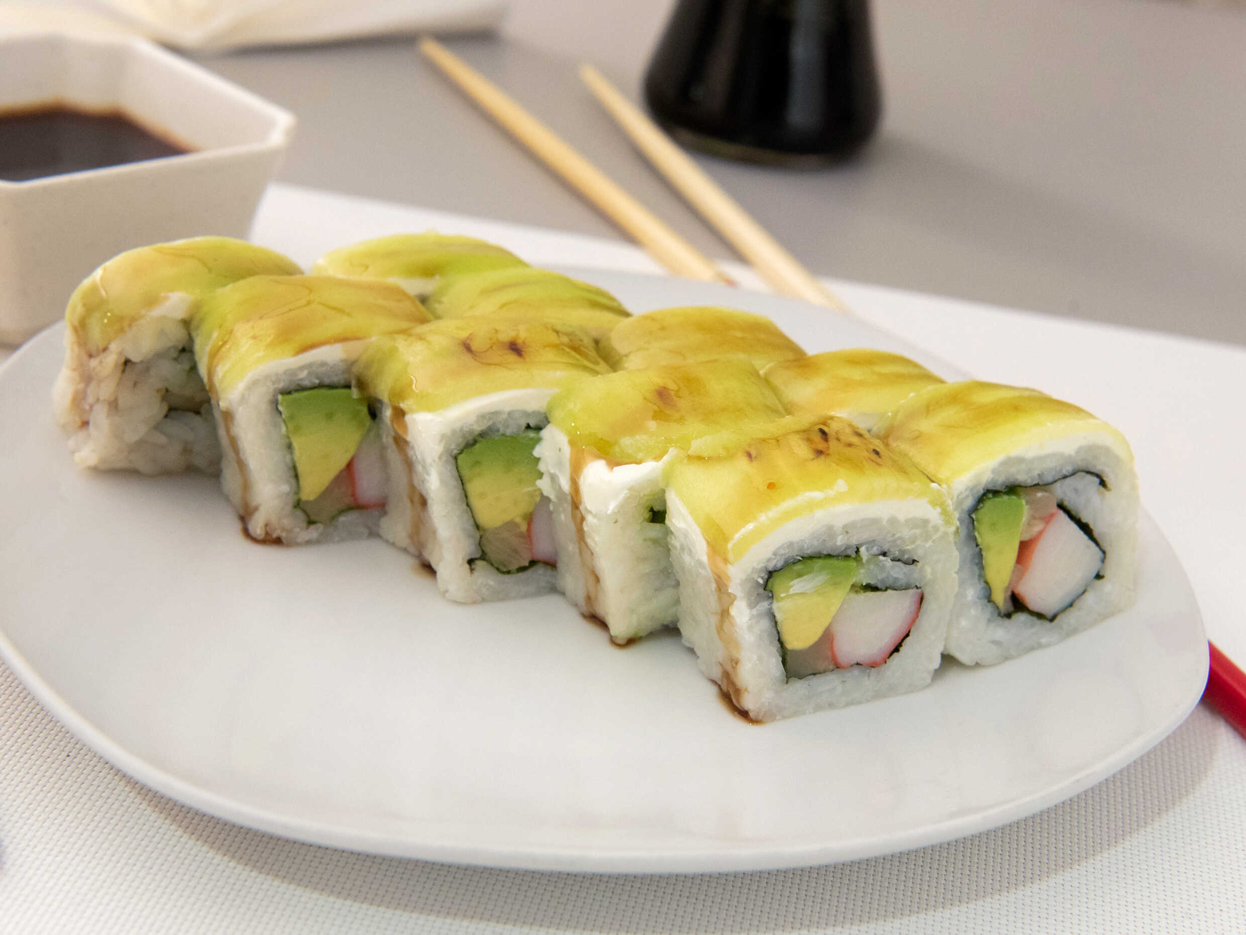 Rollo de surimi,queso,aguacate empanizado encima salsa de kushiague