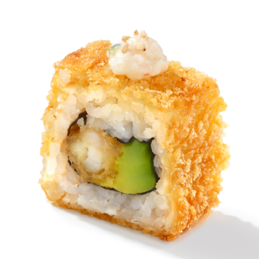 10 pzs | 220 gramos. Rollo empanizado con camarón empanizado y aguacate por dentro; queso crema por fuera; servido con salsa tampico y ajonjolí.