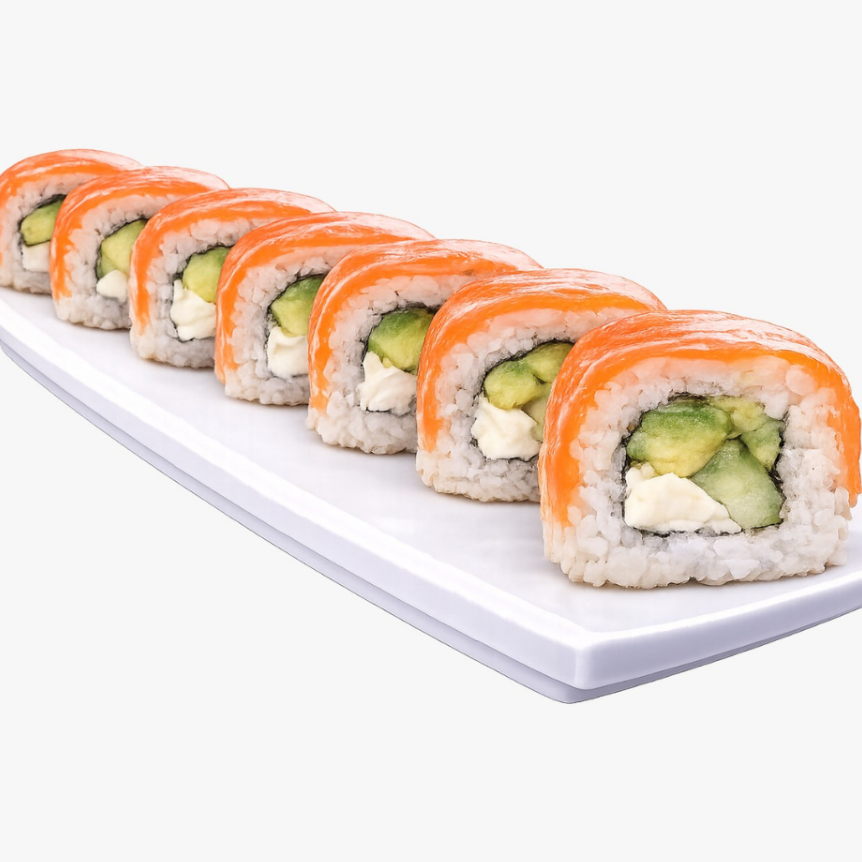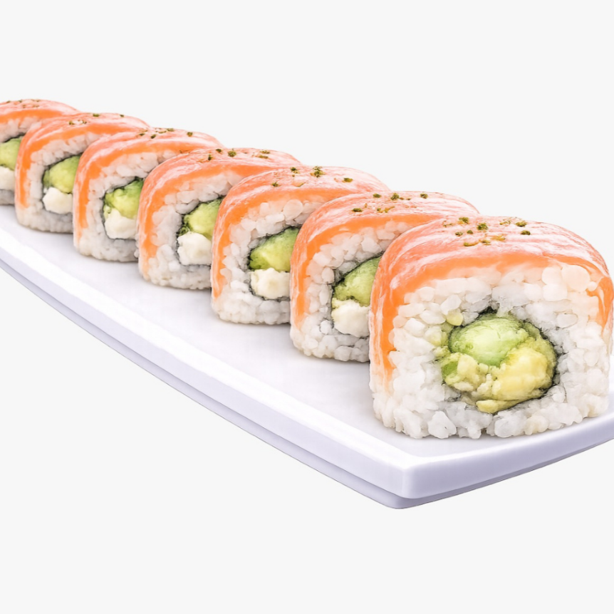 Rollo relleno de aguacate, pepino y queso, cubierto de salmón (50 grs)