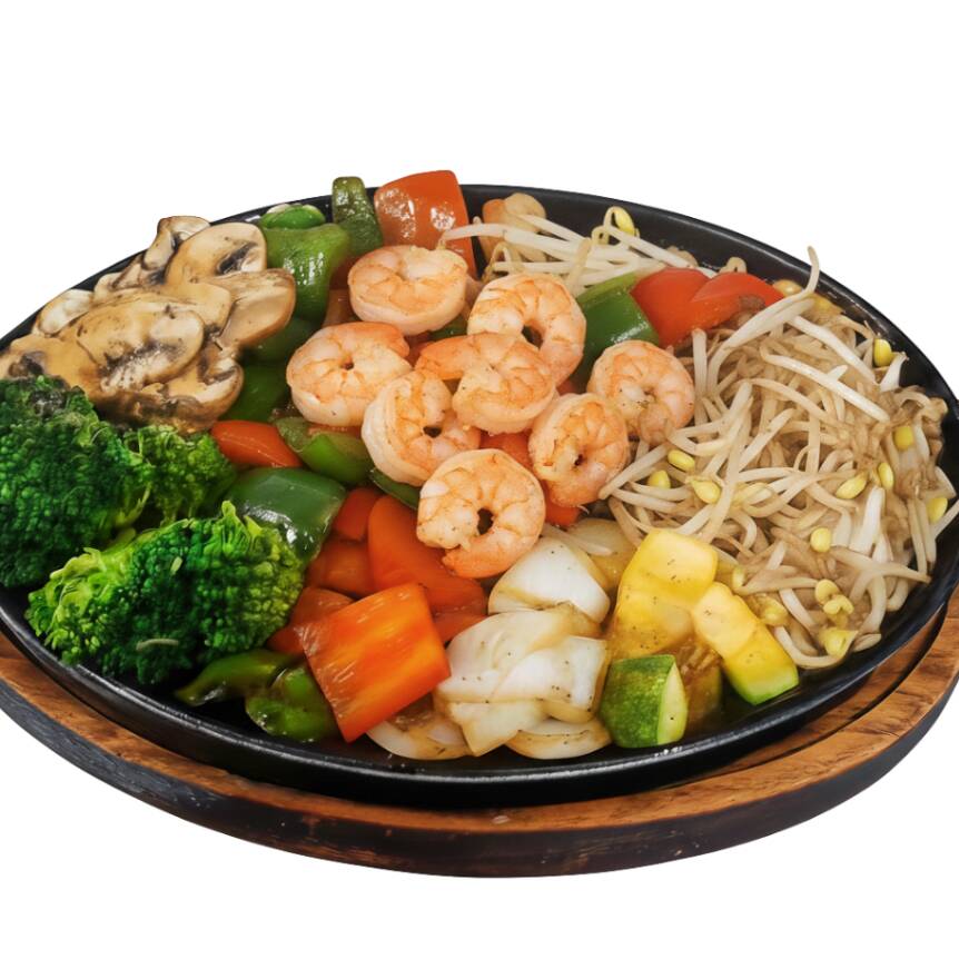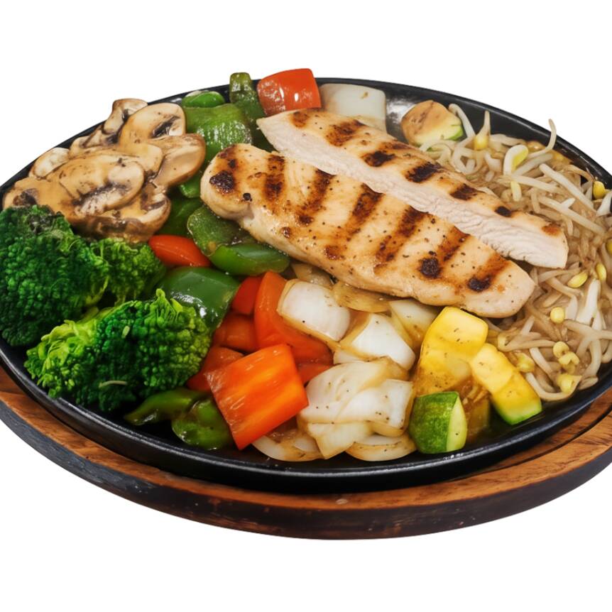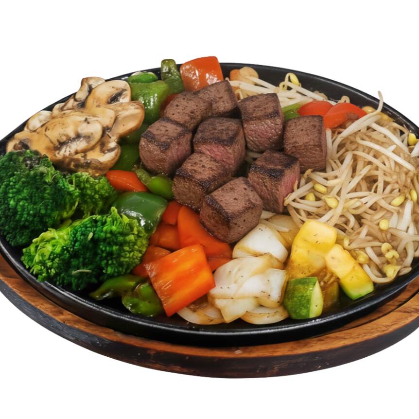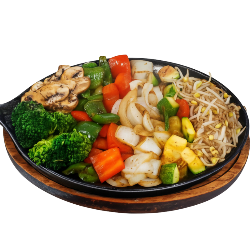 Verduras asadas a la plancha (Calabaza, cebolla, pimiento, champiñón, brócoli, germen de soya) servidos en plancha caliente, acompañados de 80 grs de filete, sazonados con soya. (200 grs)