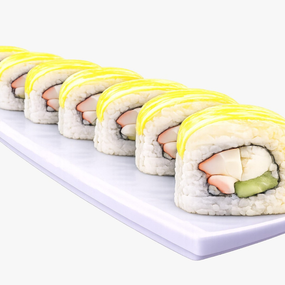Rollo envuelto en mango (temporada), relleno de cangrejo y aguacate (30 grs).