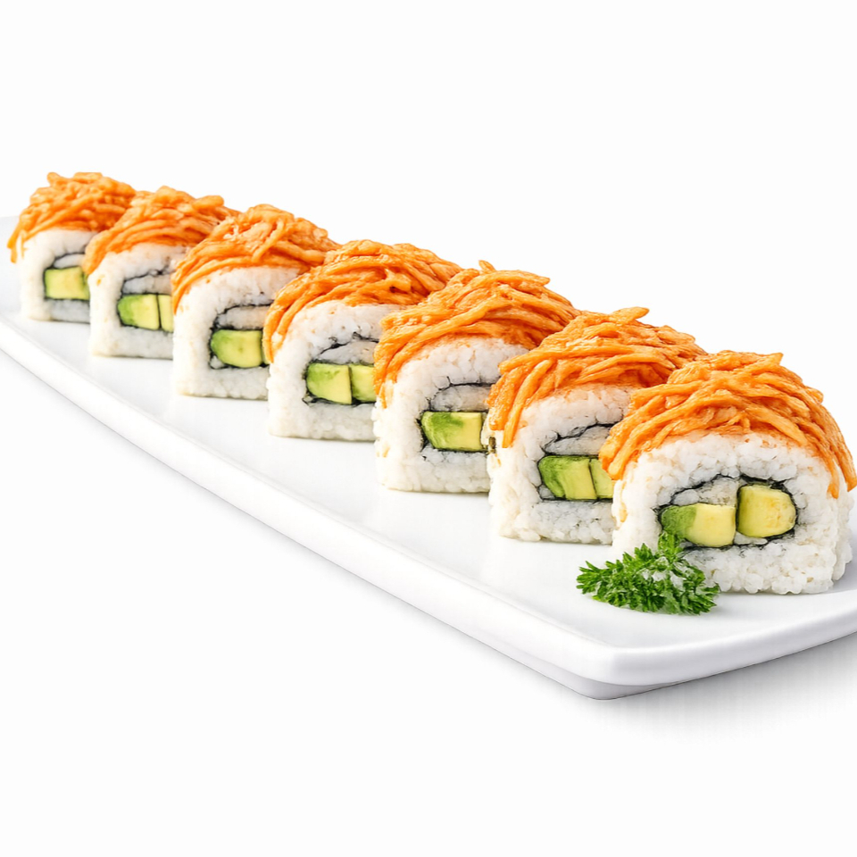 Zanahoria, queso crema y camarón, tempura por dentro y por fuera cubierto de aguacate (50 grs)