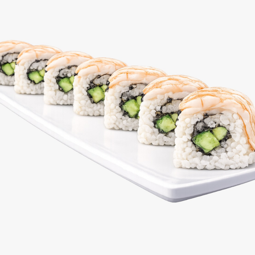 Relleno de aguacate, queso crema y pepino cubierto de camarón (30 grs).