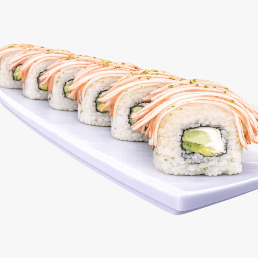 Relleno de aguacate y pepino, cubierto con cangrejo y bañado en aderezo de chipotle (50 grs)