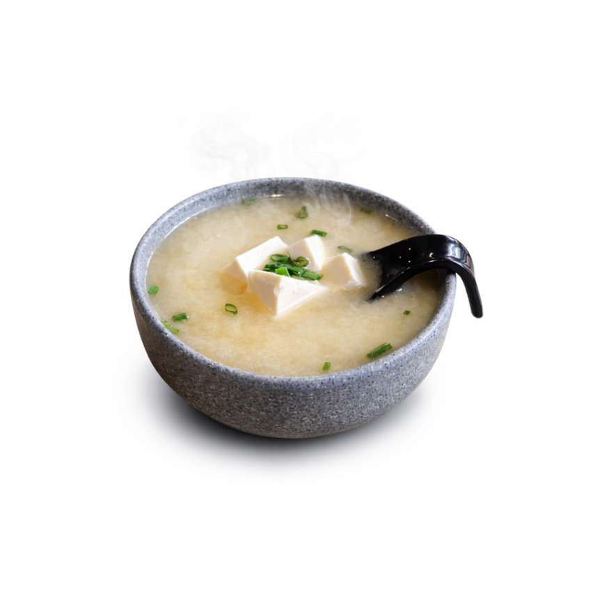 Sopa tradicional de frijol de soya servida con tofu y cebollin. (300ml)