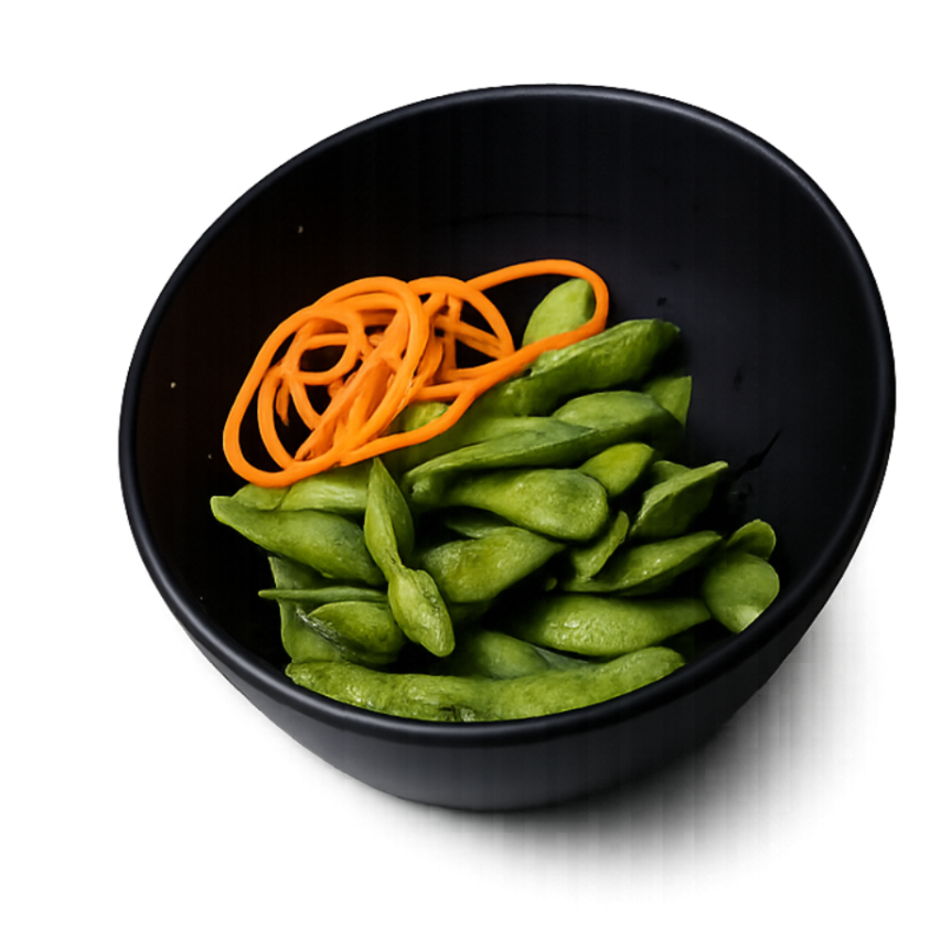 Frijol de soya tierno en vaina (120grs) cocidos al vapor con una pizca de sal.