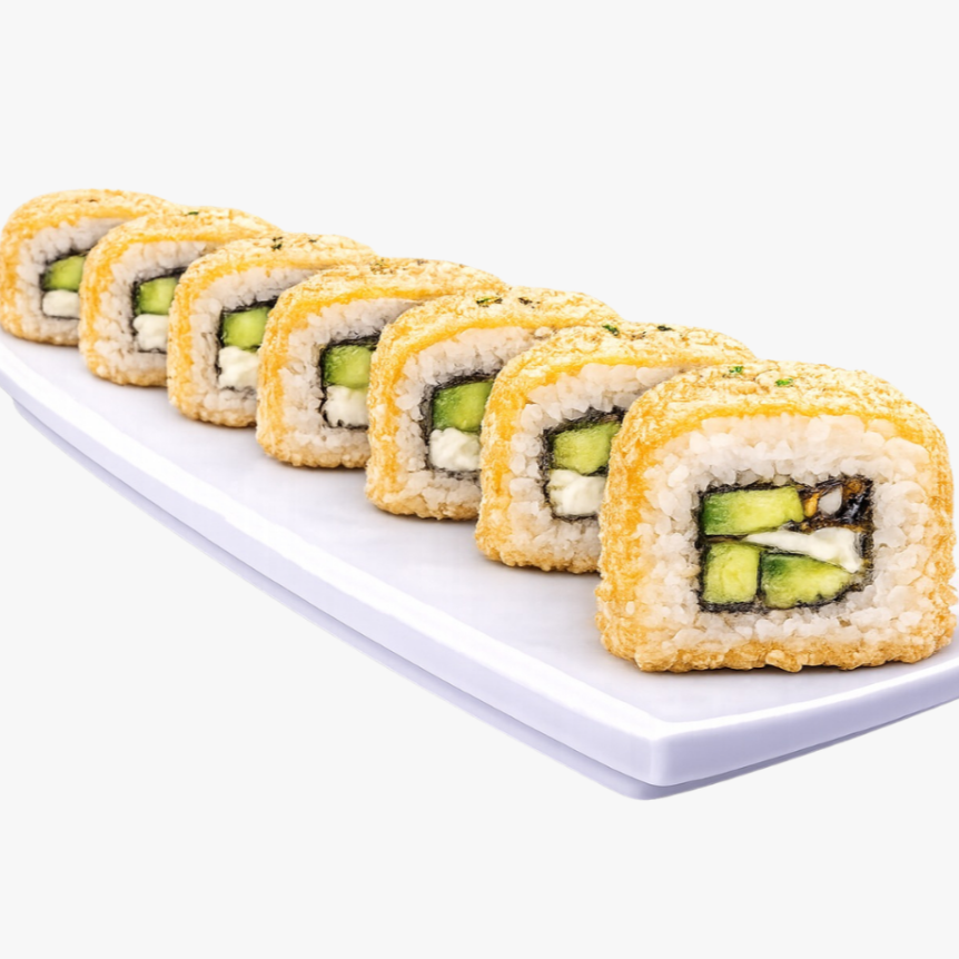 Rollo de arroz (150 grs) por fuera ajonjolí relleno de aguacate, pepino y una proteína de tu elección (30 grs)