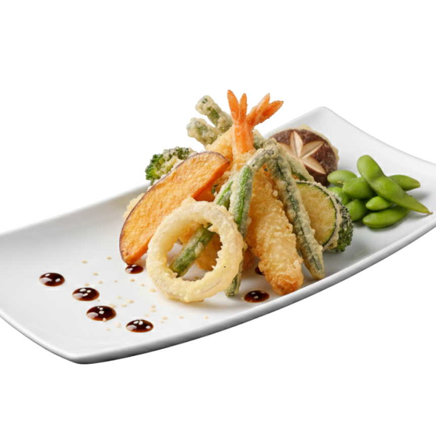 Combinación perfecta de verduras (Calabaza, brócoli, cebolla, champiñón y zanahoria) con 3 pzas de camarón rebosados en pasta tempura