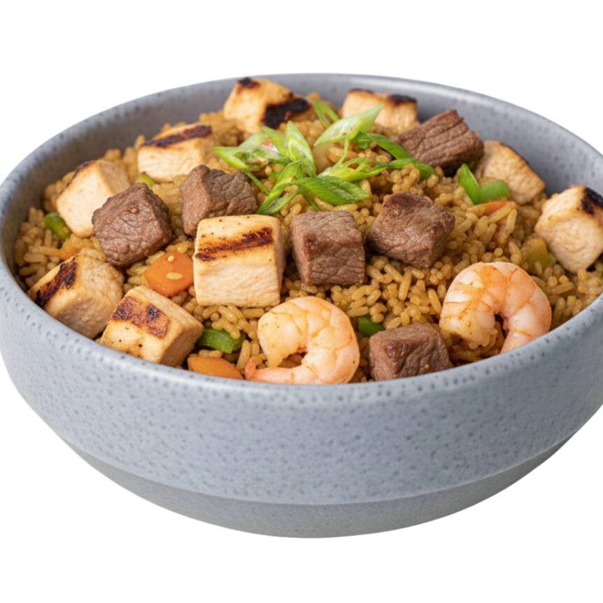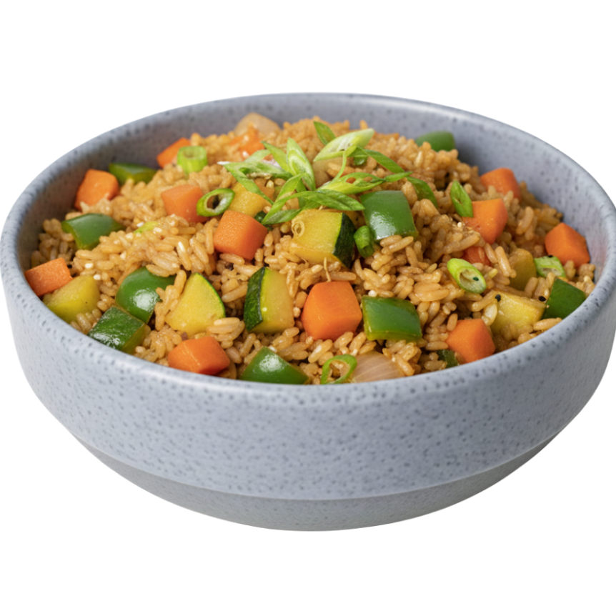 Arroz frito a la plancha con verduras (zanahoria, cebolla, calabaza, pimiento verde), huevo y 60 grs de proteina.