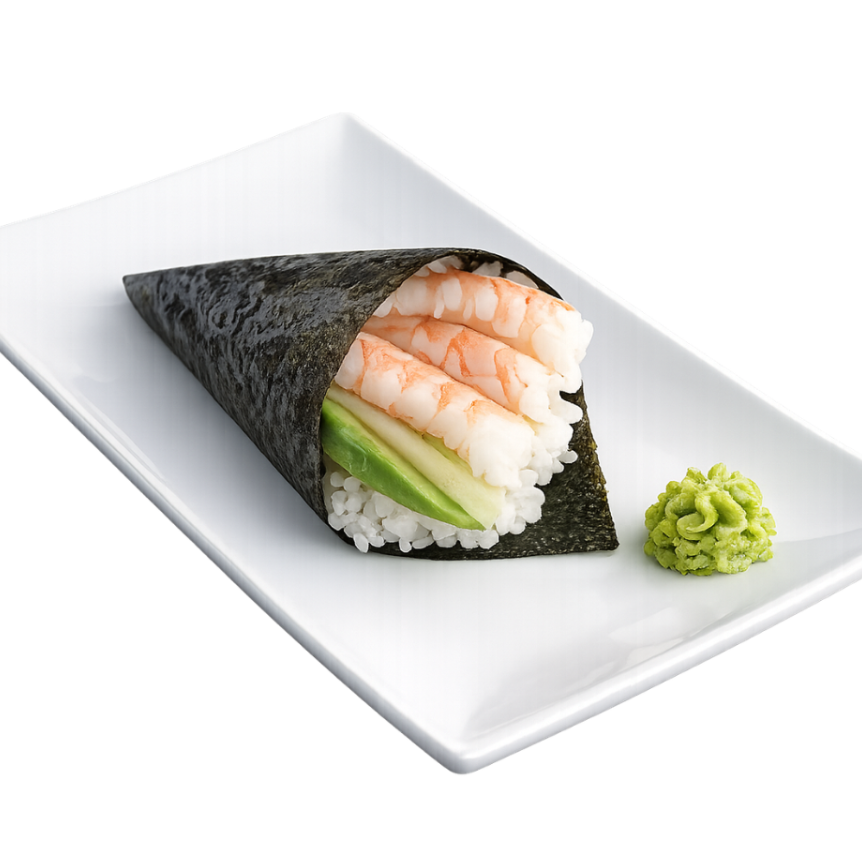 Cono de alga nori con arroz de sushi (70 grs), pepino, aguacate y 20 grs de camaron.