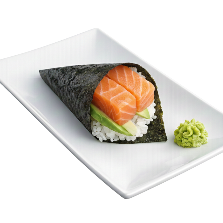 Cono de alga nori con arroz de sushi (70 grs), pepino, aguacate y 30 grs de salmon.