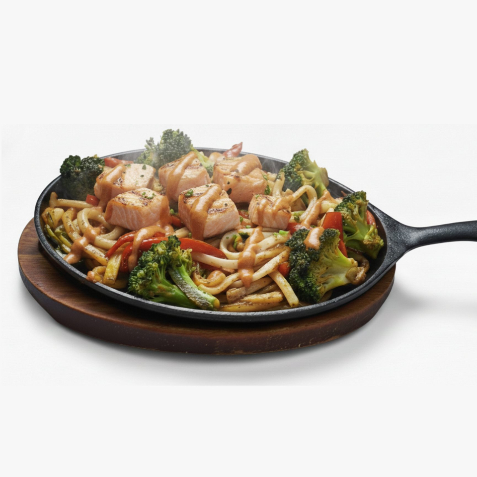 Pasta udon (50 grs), verduras (Champiñón, cebolla, zanahoria) y salmón asados a la plancha servidos con un toque de salsa chipotle. (60 grs)