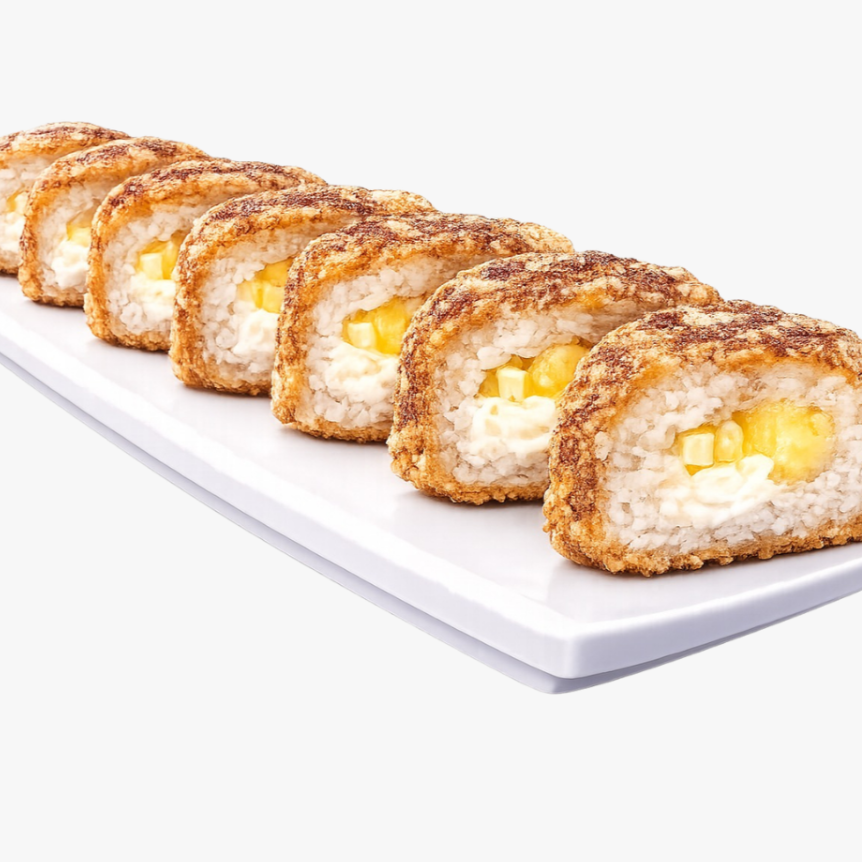 Rollo empanizado y bañado en canela y azúcar, relleno de mango y queso crema (50 grs)