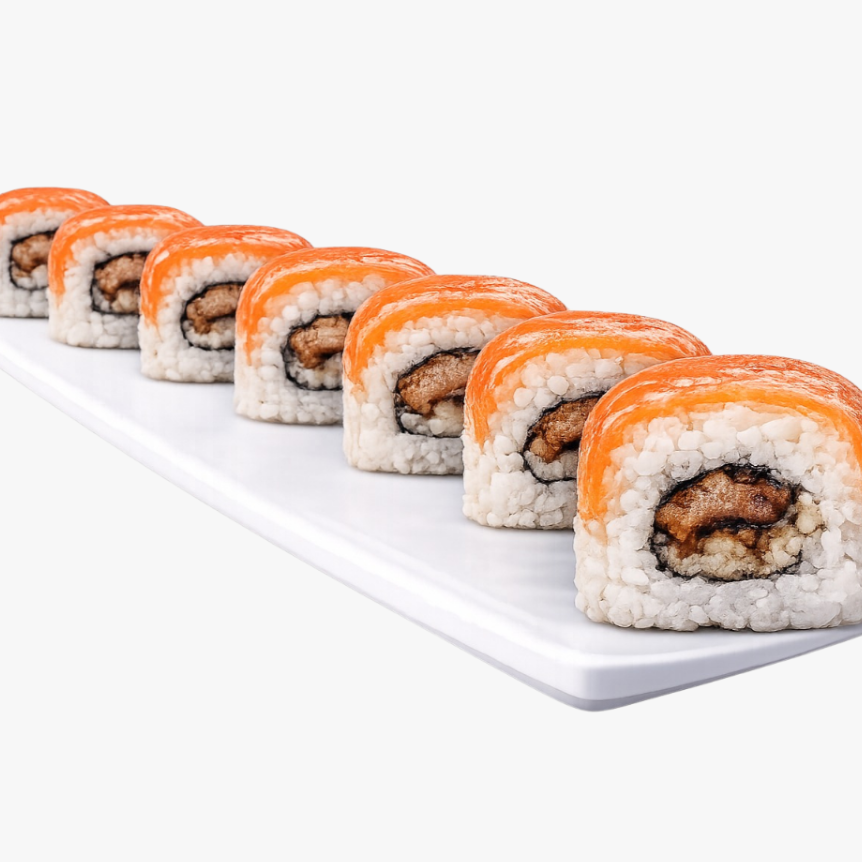 Cubierto de salmón, relleno de atún spicy (40 grs.) y pepino, servido con salsa dulce.