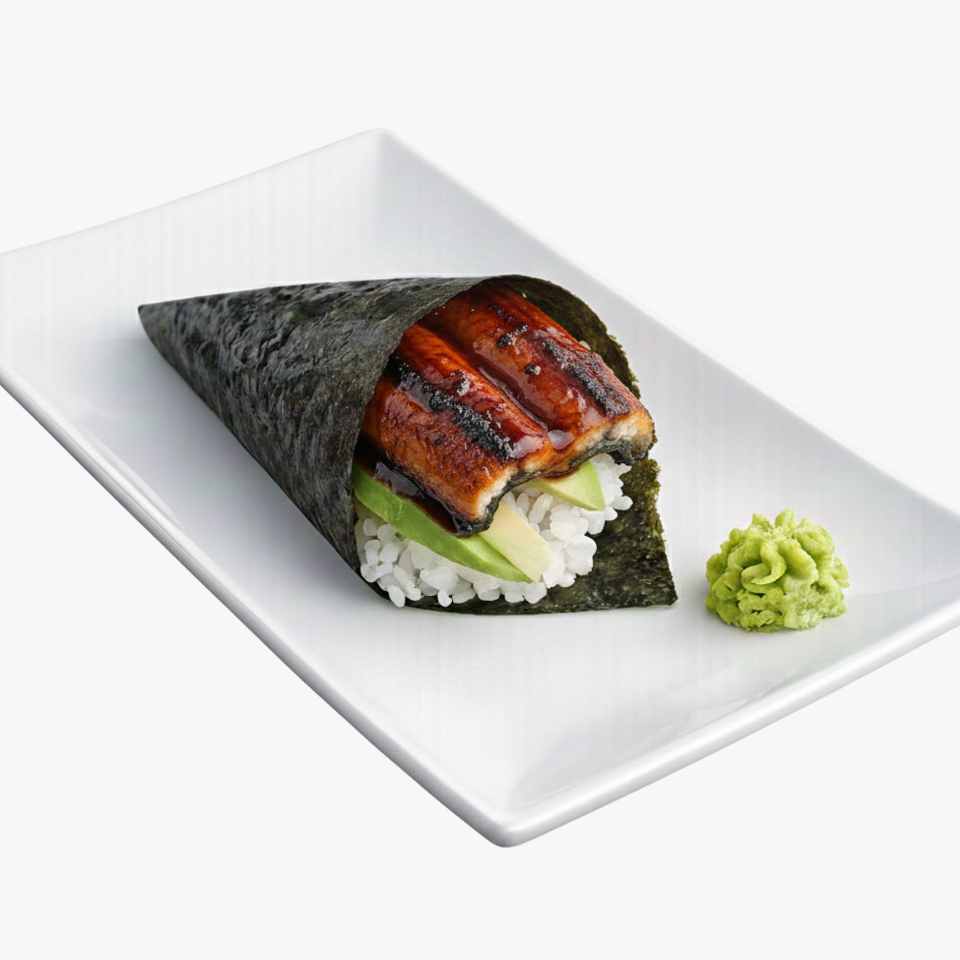 Cono de alga nori con arroz de sushi (70 grs), pepino, aguacate y 30 grs de anguila.