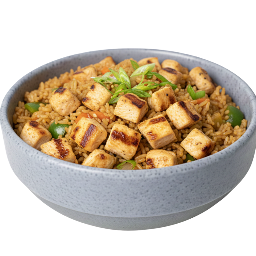 Arroz frito a la plancha con verduras (zanahoria, cebolla, calabaza, pimiento verde), huevo y 60 grs de pollo.