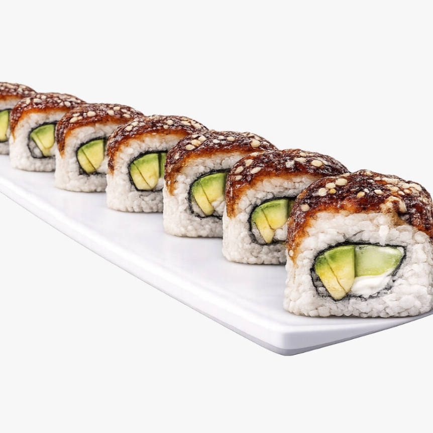 Relleno de aguacate, pepino y queso cubierto de anguila ahumada servido con salsa dulce (30grs).