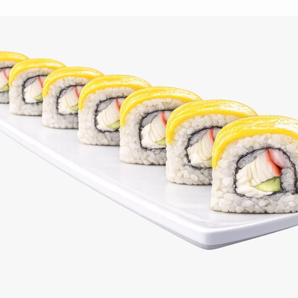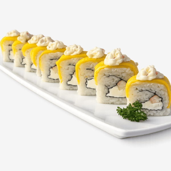 Relleno de camarón queso crema, pepino, cubierto de mango (temporada) y aguacate (30 grs)