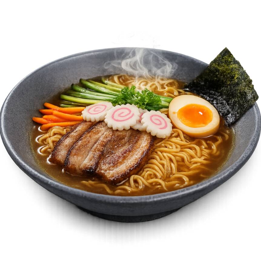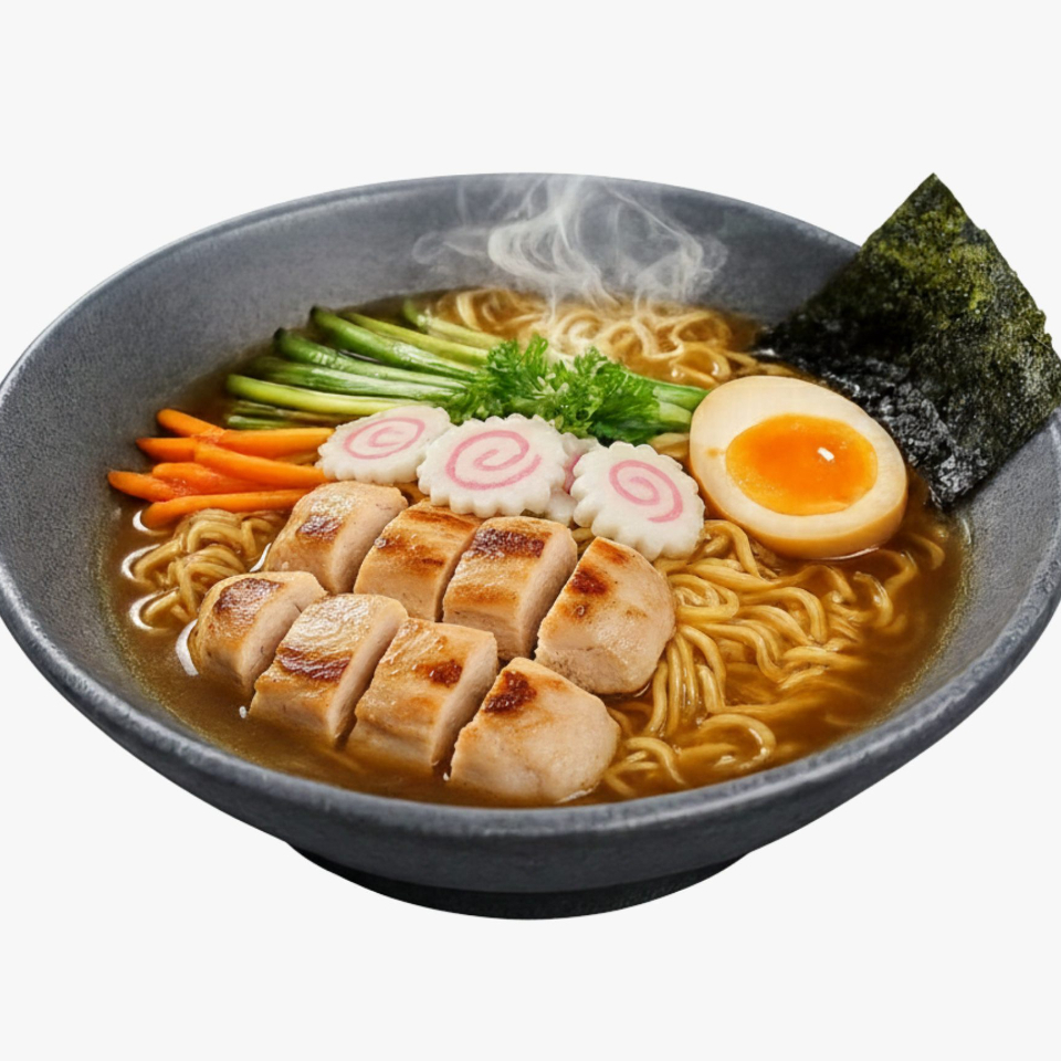 Fondo y pasta ramen tradicionales (300ml), servidos con bastones de calabaza, zanahoria, cebolla, huevo cocido y proteína (60 grs)
